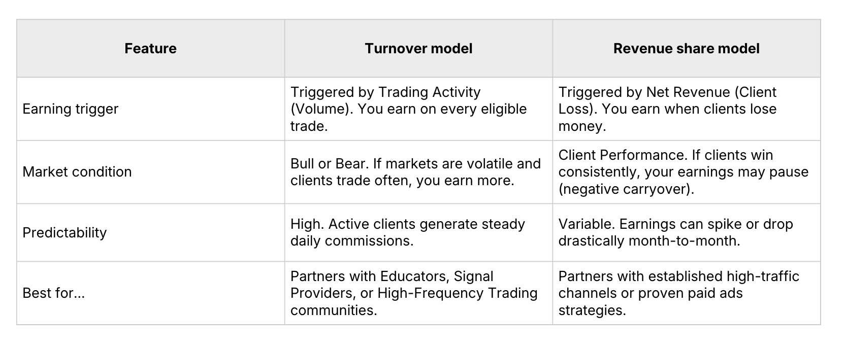 • Consistency over volatility: This model is ideal for partners with active, high-frequency trading clients, offering smoother cash flow compared to CPA or Revenue Share.